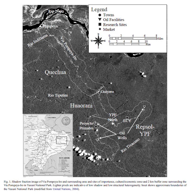 These factors included the distance from roads, rivers, research facilities, oil facilities, markets and towns, and land ownership by colonists, native inhabitants, and an oil company. We found the annual rate of deforestation is currently only 0.11%, but that this rate is increasing with time and, assuming that the trend of increasing rate of forest loss continues, we would predict that by 2063, 50% of the forest within 2 km of an oil access road will be lost to unhindered colonization and anthropogenic conversion.